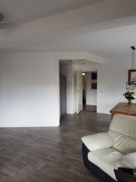 Via de trapopgang komt u uit op de overloop van het appartement. Het appartement heeft een ruime woonkamer (30m²) met toegang tot het ruime balkon (10m2) en half open keuken. Het appartement beschikt over twee slaapkamers met respectievelijke oppervlakten van 15m² en 9m². De badkamer is voorzien van een bad, vaste wastafel, tweede toilet en wasmachine aansluiting.
