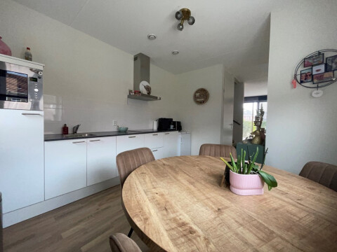Hal met de meterkast, trapopgang en de moderne toiletruimte met fonteintje. Sfeervolle woonkamer met toegang tot de achtertuin. half open moderne keuken welke is voorzien van een inbouw koelkast, 4 pits fornuis, afzuigkap en vaatwasser.