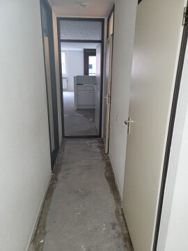 Rechts van de entreegang is de badkamer met douche, wastafel en toilet. 1 Ruimte verder bevind zich een aparte berging met de aansluiting voor de wasmachine. Links van de gang is de deur naar de slaapkamer (ca.12m2). Aan het einde van de gang komt u de woonkamer met open keuken in hoekopstelling welke is voorzien van 4 pits fornuis, afzuigkap en oven. Vanuit de woonkamer heeft u toegang tot de loggia van ca 5m2.