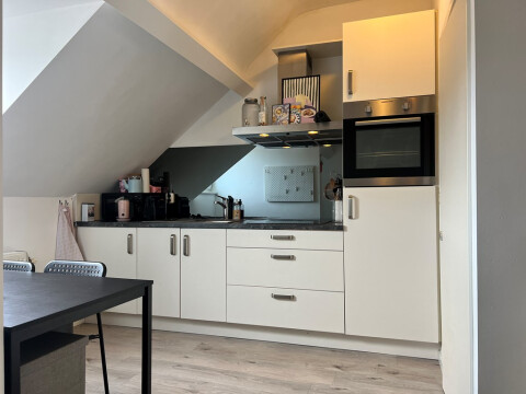 Het appartement heeft een woonkamer met open keuken welke is v.v. een nette installatie met de volgende apparatuur; combi oven, kookplaat, afzuiging en koelkast.