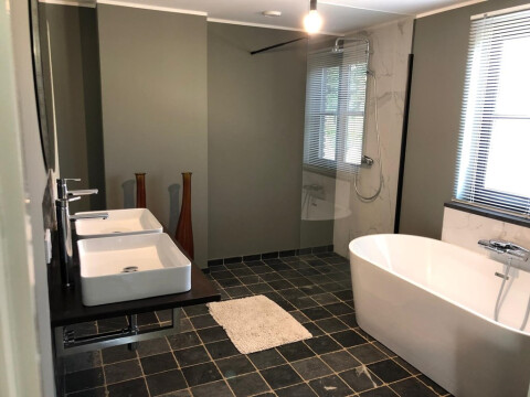 De luxe badkamer is uitgerust met een vrijstaand ligbad, inloop douche en wastafel meubel.